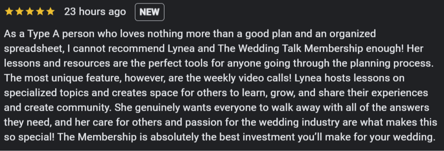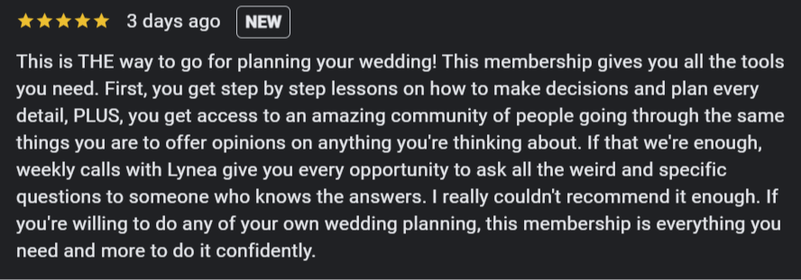 "Before I was an industry pro, I was a DIY budget bride lost in the wedding sauce. When I dreamt up this membership, it was like reaching back into the past, asking myself what I needed. What could have prevented me from making the mistakes I made? How could I have been more supported? And ooooh baby it is GOLD!"