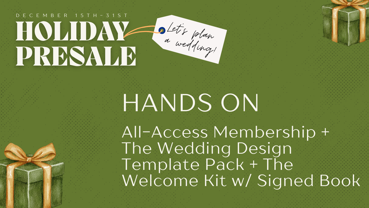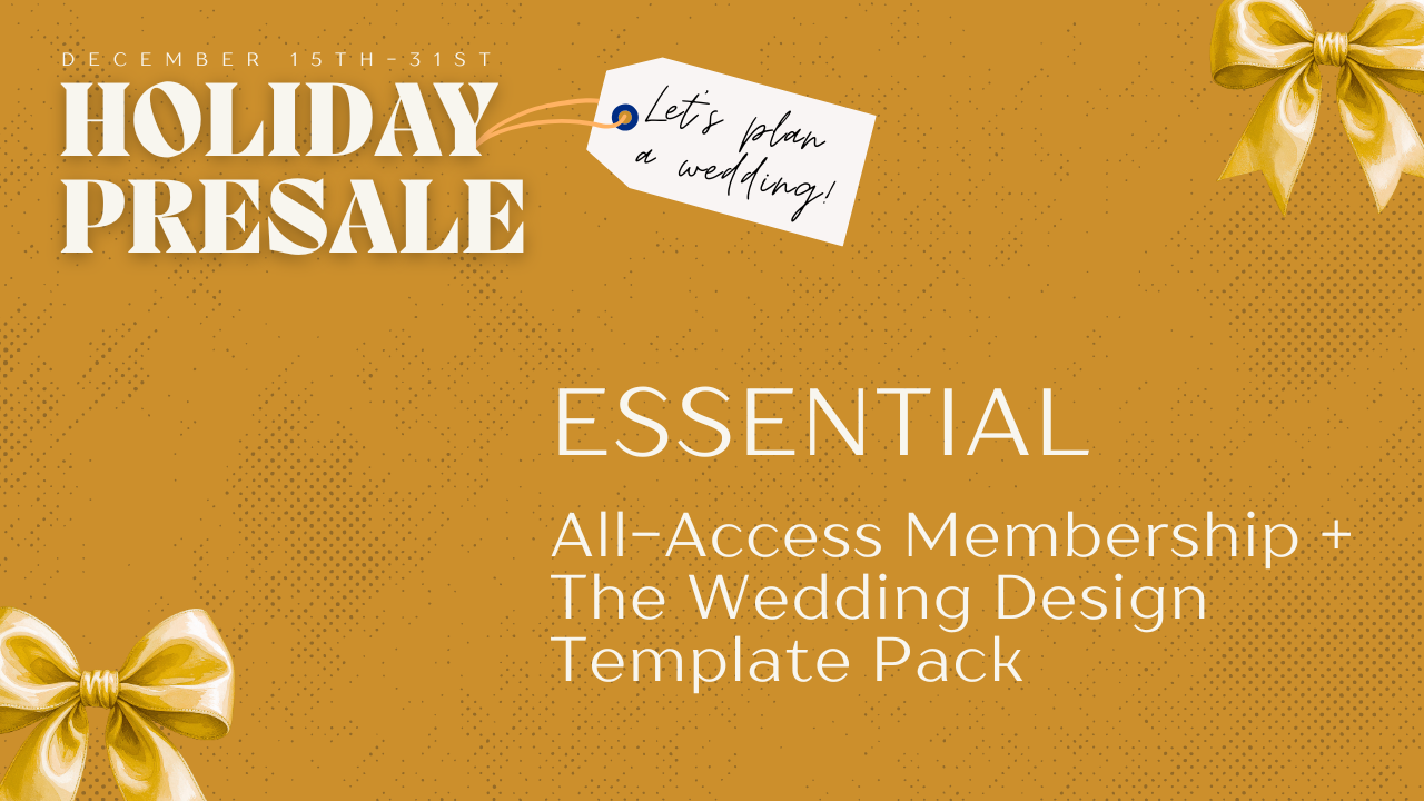 Full access to the Membership plus the Template Pack (3 templates: Color & Texture, Fundamentals & Decor, Florals & Attire) 3,000+ visuals for you to drag and drop your wedding design to life. Uses Canva Pro. [ORIG. PRICE: $689.99]